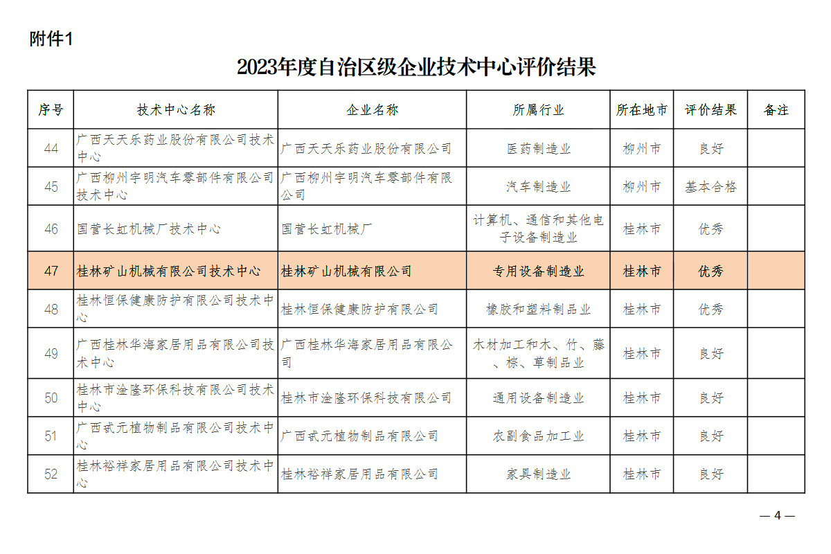 6月27日,自治區(qū)工業(yè)和信息化廳公布2023年自治區(qū)級(jí)企業(yè)技術(shù)中心評(píng)價(jià)結(jié)果的通知,根據(jù)《廣西壯族自治區(qū)認(rèn)定企業(yè)技術(shù)中心管理辦法》(桂工信科技〔2018〕228號(hào))有關(guān)規(guī)定,對(duì)2017年、2019年、2021年獲認(rèn)定的自治區(qū)級(jí)企業(yè)技術(shù)中心組織開(kāi)展了復(fù)核評(píng)價(jià),符合此次評(píng)價(jià)年限的自治區(qū)級(jí)企業(yè)技術(shù)中心共有94家,其中89家提交了評(píng)價(jià)材料,5家企業(yè)技術(shù)中心因經(jīng)營(yíng)困難或者企業(yè)重組等原因申請(qǐng)暫緩評(píng)價(jià)。89家提交材料的企業(yè)技術(shù)中心評(píng)價(jià)結(jié)果:優(yōu)秀(90分以上)27家、良好(65-90分)53家、基本合格(60-65分)9家。桂林礦山機(jī)械有限公司憑借在科技創(chuàng)新能力、新產(chǎn)品研發(fā)等方面較大的優(yōu)勢(shì),以優(yōu)秀成績(jī)通過(guò)2023年復(fù)核評(píng)價(jià)。