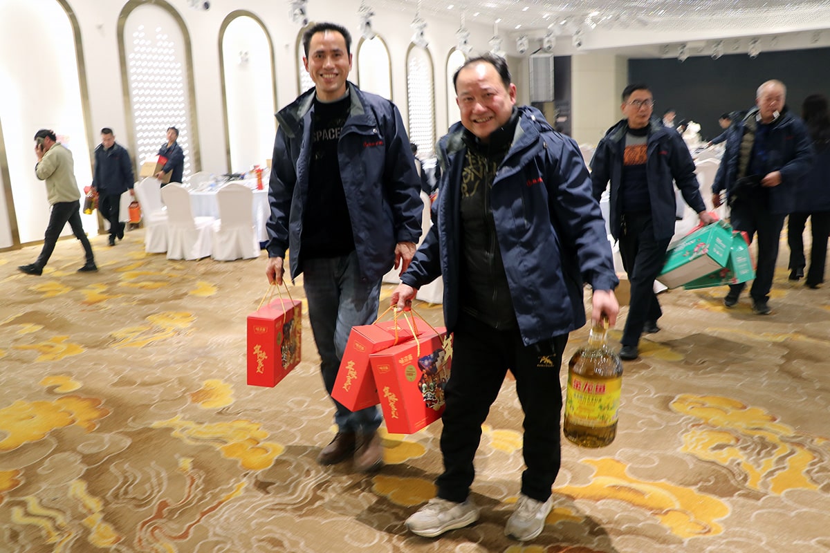 隨著主持人的呼喚,現場氛圍頓時升溫,一個個幸運兒陸續上臺。有的人抽中了心儀已久的電子產品,激動得手舞足蹈;有的人則抽中了家用電器,計劃著春節期間為家人做一頓可口盛宴,F場不時傳來歡呼聲和掌聲。尤其是當特等獎揭曉,獲獎員工更是端上酒杯沖上舞臺,與董事長干杯同慶,惹得大家歡笑不斷,氣氛十分熱烈。